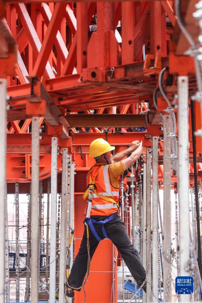 5月3日,中建三局的工人在海南中心項目的“空中造樓機”內施工。
