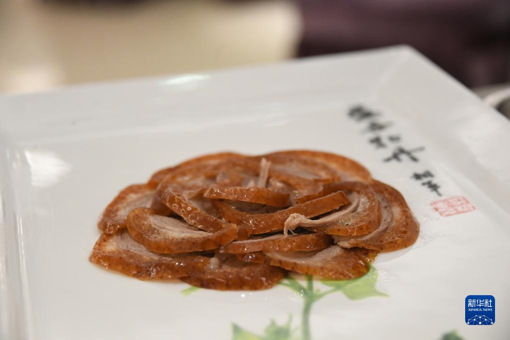 烤制和片鴨是烤鴨制作過(guò)程中重要的工序,也是烤鴨師不可或缺的技術(shù)??局茣r(shí),夏志鵬要用一根兩米多長(cháng)的烤鴨桿,將掛好鉤的鴨坯挑起,三步之內用巧勁將鴨子放入爐內,做到“三不粘”——不粘爐口、不粘劈柴、不粘爐檔。片鴨同樣考驗廚師的功力,烤鴨烤制完成從烤爐拿出時(shí),表面溫度可達80攝氏度以上,但為了讓顧客吃到口感更好的烤鴨,烤鴨師要耐著(zhù)高溫在第一時(shí)間片好鴨肉?!翱绝啘囟让拷狄粩z氏度都會(huì )影響口感,好多烤鴨廚師的手和我一樣,都是被燙得整個(gè)手指頭蛻下好幾次皮,才練好了片鴨?!毕闹均i說(shuō)。