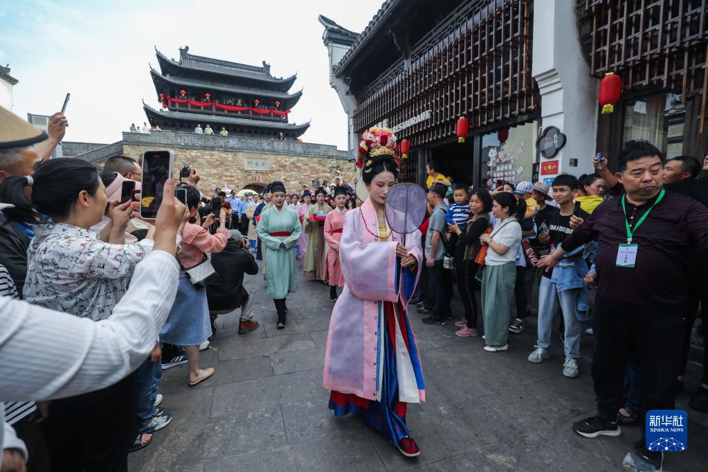 當日,浙江省建德市梅城鎮嚴州古城舉行宋韻水上婚禮表演,通過(guò)出閣、梳妝、登船、親迎、禮拜的五幕演繹,吸引了人們駐足觀(guān)禮。有著(zhù)1000多年歷史的嚴州古城地處新安江、富春江、蘭江交匯處,歷史文化積淀深厚。