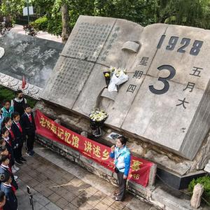 5月3日,小學(xué)生在“五三慘案”紀念碑前聽(tīng)志愿者講述歷史。