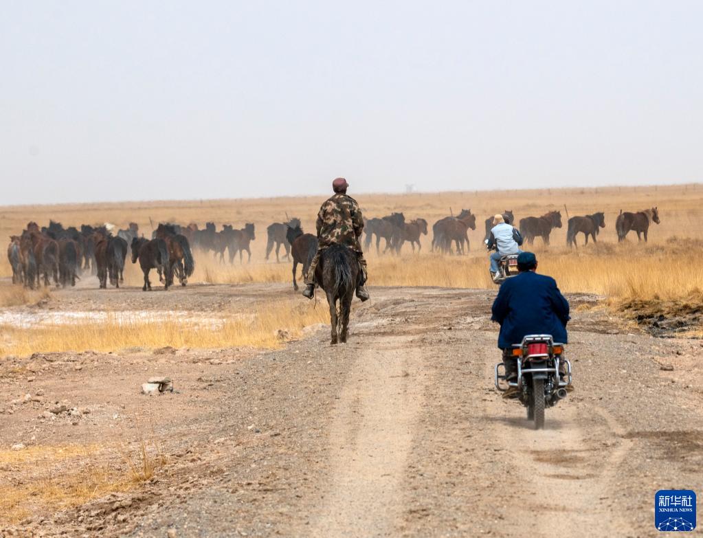 5月3日,在阿克塞縣阿伊納鄉海子草原,牧民趕著(zhù)馬群進(jìn)行轉場(chǎng)。