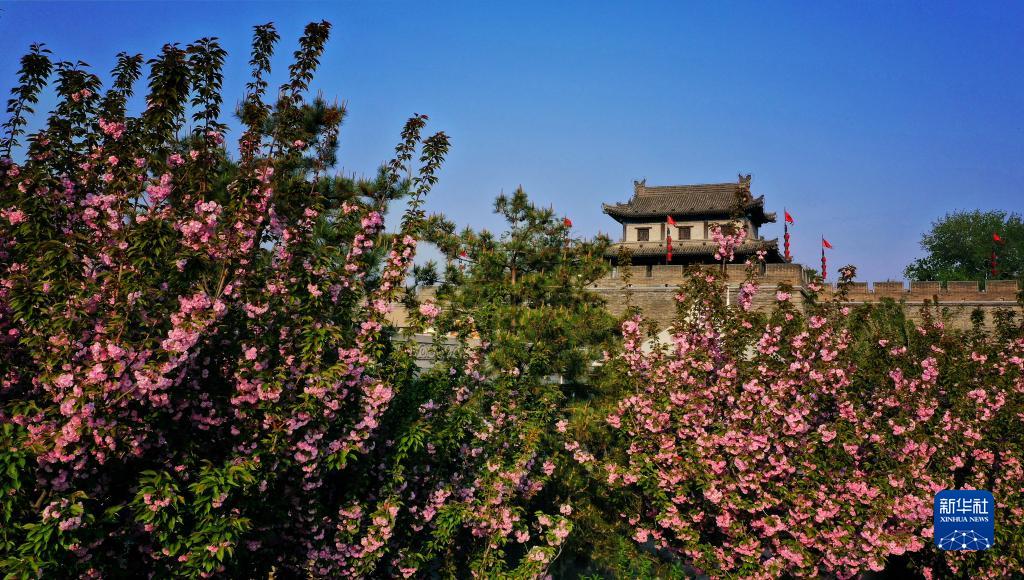 西安城墻掩映在繁花之中(4月1日攝,無(wú)人機照片)。