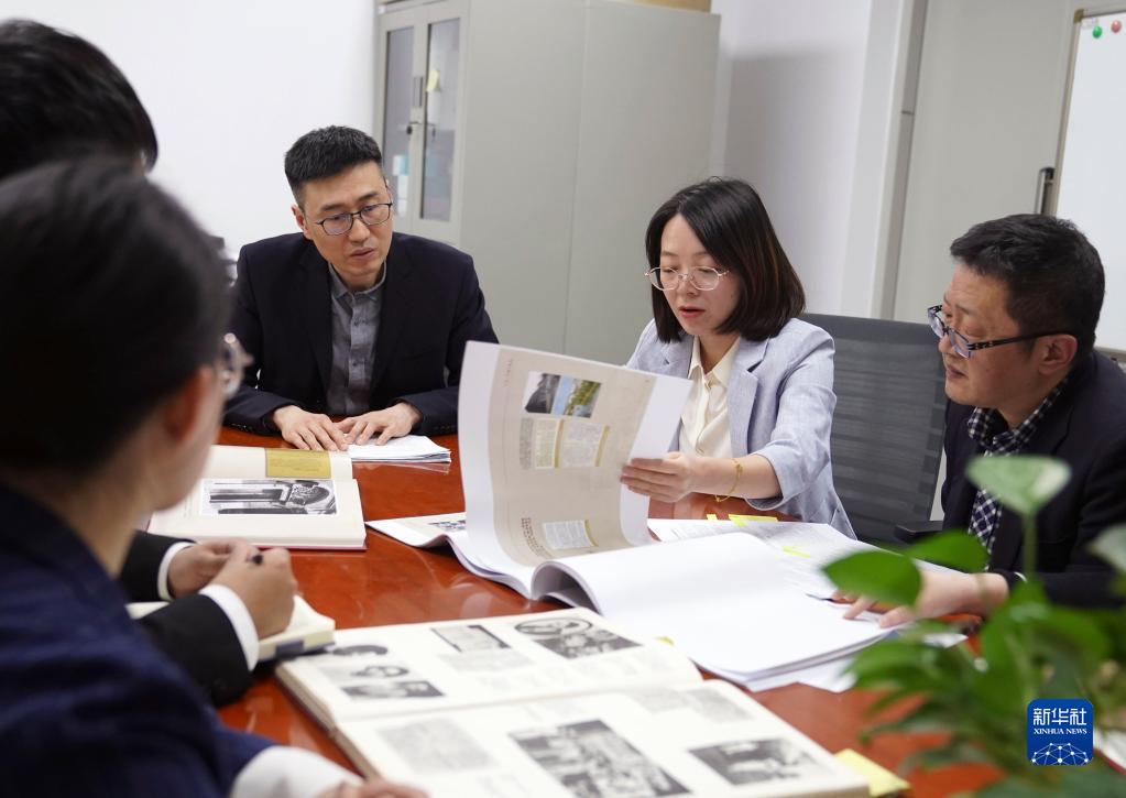 4月28日,在上海市檔案館的辦公室內,利用部工作人員方華(右二)和同事們討論策展工作的細節。