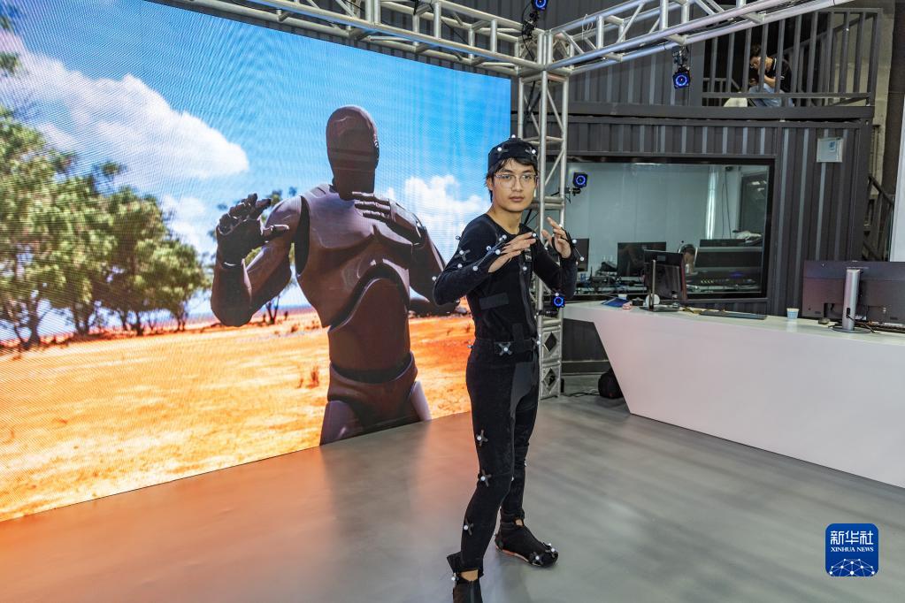 5月5日,在中國影視科技創(chuàng )新成果展上,參展企業(yè)展示光學(xué)動(dòng)捕技術(shù)。