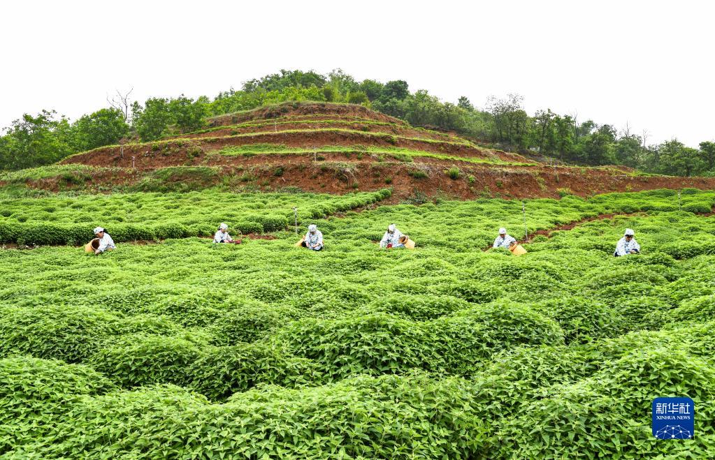 5月5日,河南省濟源市下冶鎮下韓旺村農民在冬凌草種植基地采摘冬凌草。