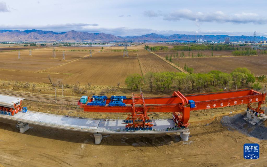 5月5日拍攝的包銀高鐵跨萬(wàn)甘鐵路特大橋箱梁架設施工現場(chǎng)(無(wú)人機照片)。