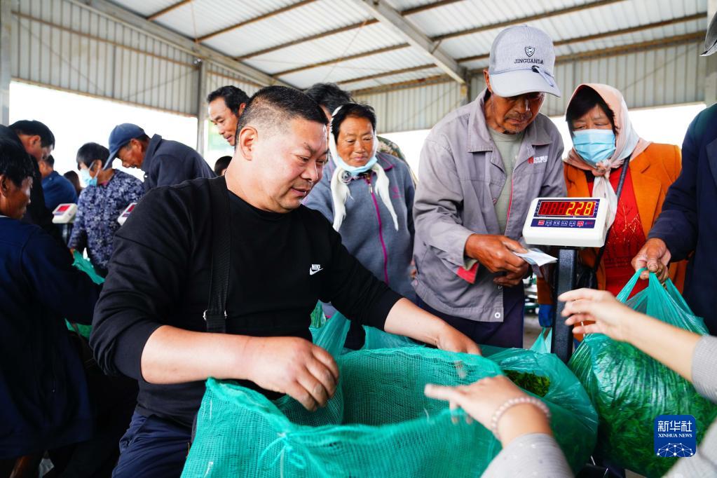 5月6日,在日照市嵐山區巨峰鎮薄家口茶葉交易市場(chǎng),茶農在賣(mài)鮮葉。