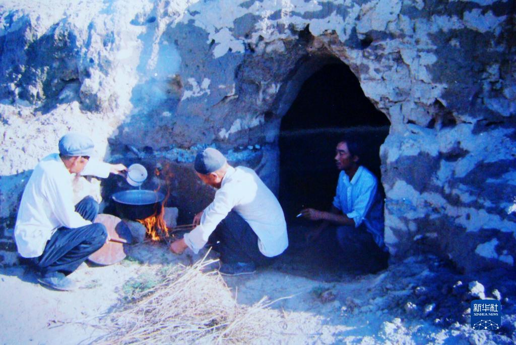1983年,“六老漢”一代治沙人在“地窩子”生火做飯。新華社發(fā)(八步沙林場(chǎng)供圖)