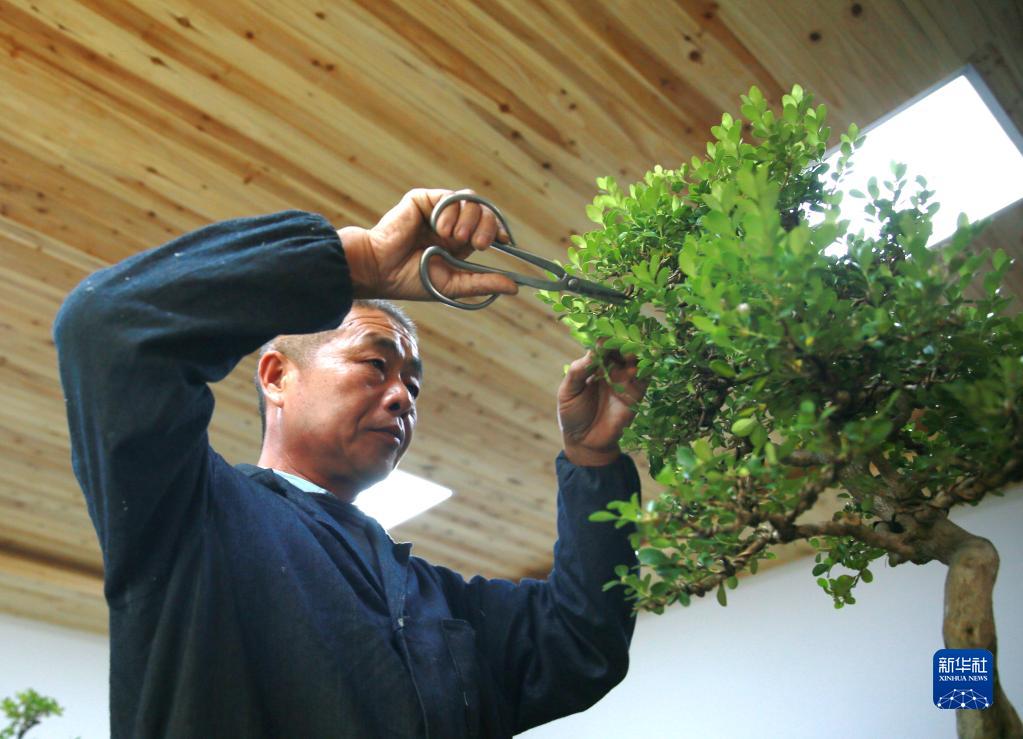 5月7日,盆景師在江蘇省揚州市江都區山水園名師工作室內修剪盆景。