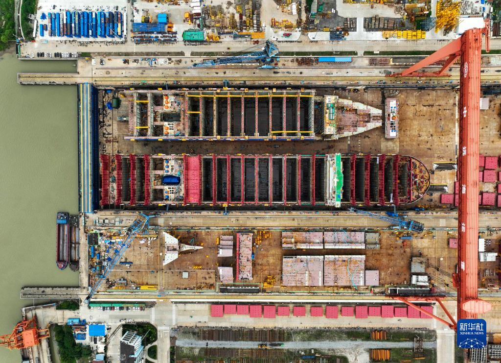 5月7日拍攝的揚州中遠海運重工有限公司3號船塢作業(yè)場(chǎng)景(無(wú)人機照片)。