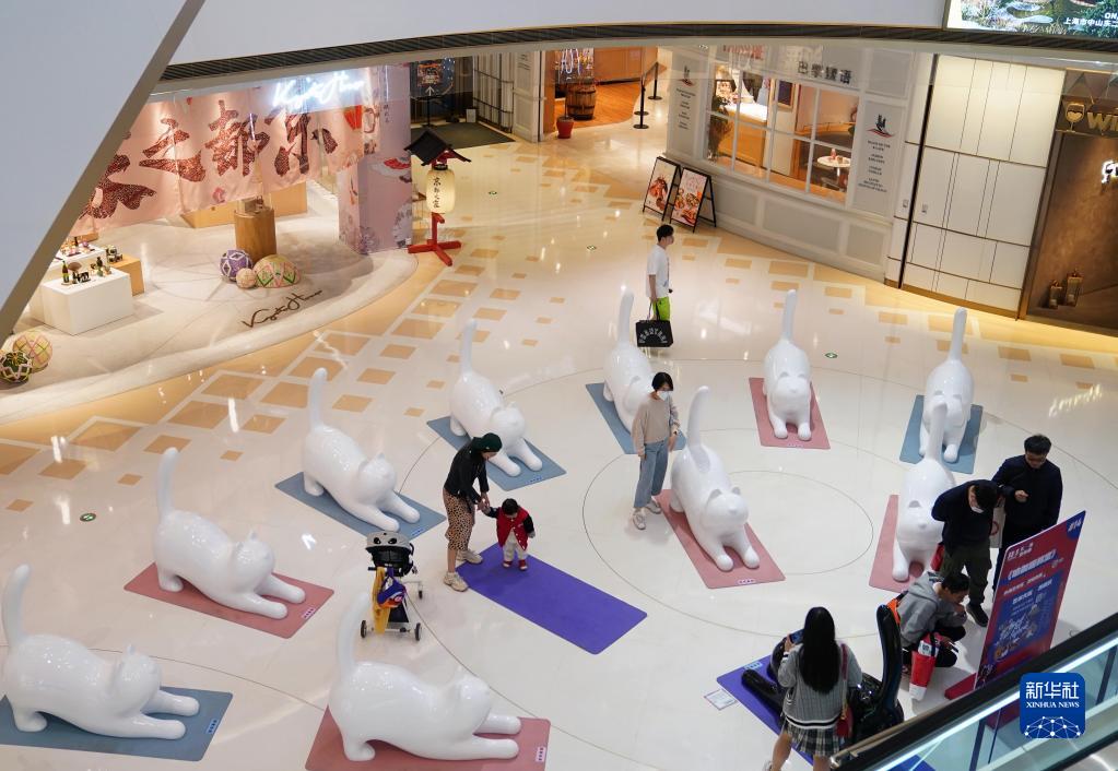 5月7日,游客在BFC外灘金融中心商場(chǎng)參觀(guān)藝術(shù)裝置《瑜伽貓教室》。