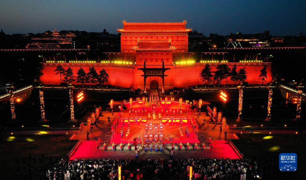 游客在西安城墻景區觀(guān)看《夢(mèng)長(cháng)安——大唐迎賓盛禮》(4月30日攝,無(wú)人機照片)。