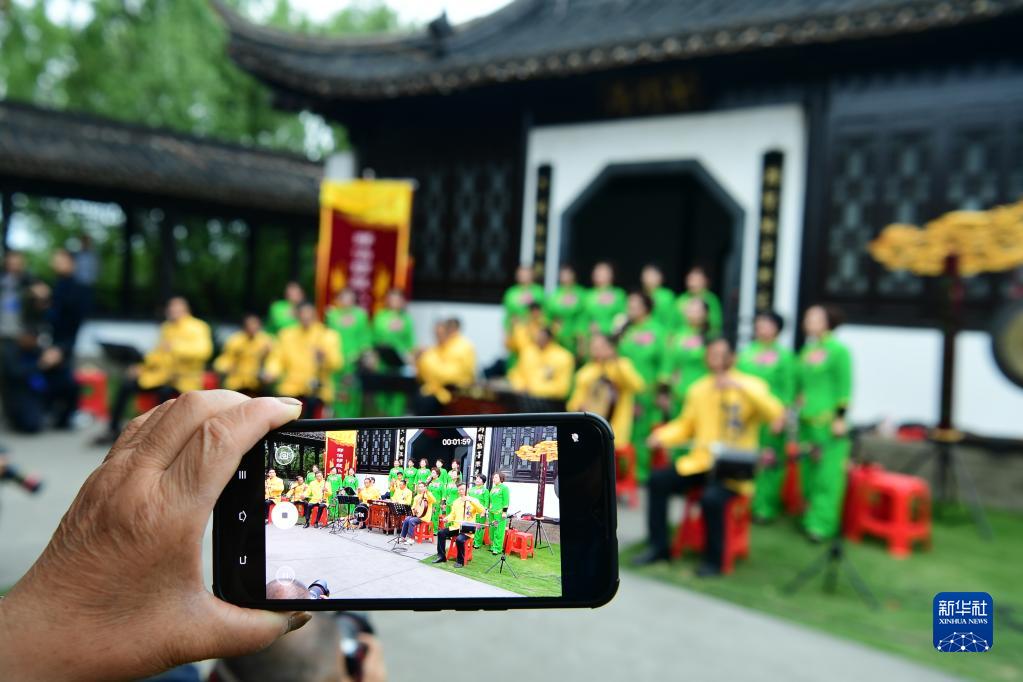 5月6日,國家級非遺項目邵伯鑼鼓小牌子表演團在江蘇省揚州市江都區邵伯鎮斗野園表演。