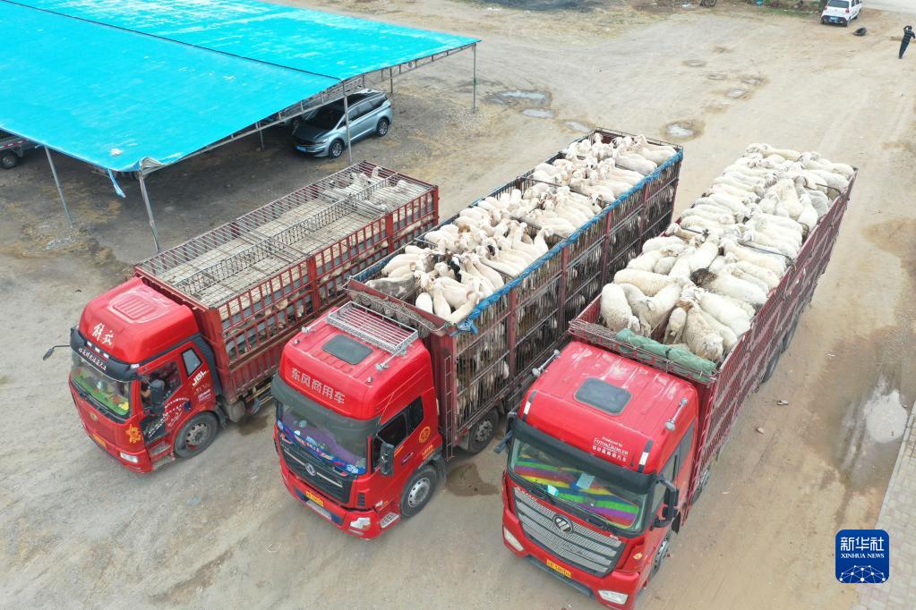 5月7日,在古浪森茂牛羊交易市場(chǎng),裝運活羊的運輸車(chē)準備發(fā)車(chē)(無(wú)人機照片)。