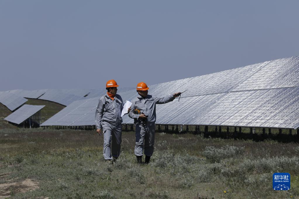 5月4日,在哈薩克斯坦阿拉木圖州的卡普恰蓋100兆瓦光伏電站內,工作人員監測太陽(yáng)能電池方陣情況。