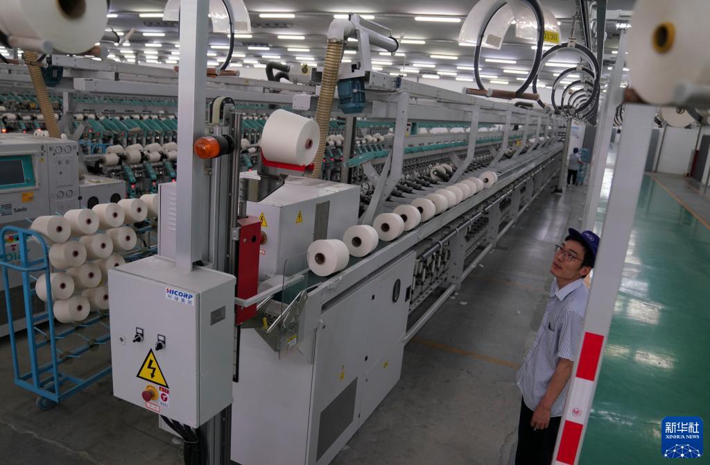 5月8日,在無(wú)錫一棉紡織集團揚子江車(chē)間,工人查看生產(chǎn)設備的運行狀態(tài)。