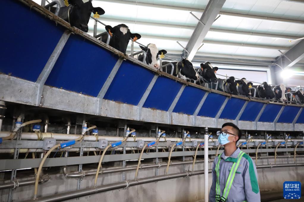 5月7日,在甘肅武威金宇浩睿農牧產(chǎn)業(yè)園,工作人員查看轉盤(pán)式擠奶機工作情況。