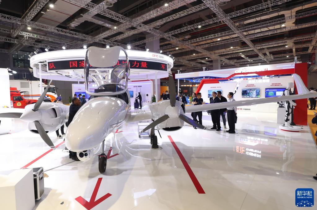5月8日,工作人員在一架空中應急指揮機旁向參觀(guān)者做介紹。