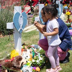 5月8日,在美國得克薩斯州達拉斯以北城鎮艾倫,人們在購物中心槍擊事件現場(chǎng)附近悼念受害者。