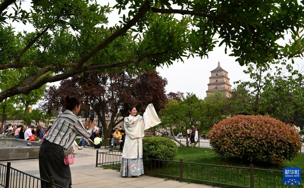 游客在西安大雁塔北廣場(chǎng)游覽留影(4月18日攝)。