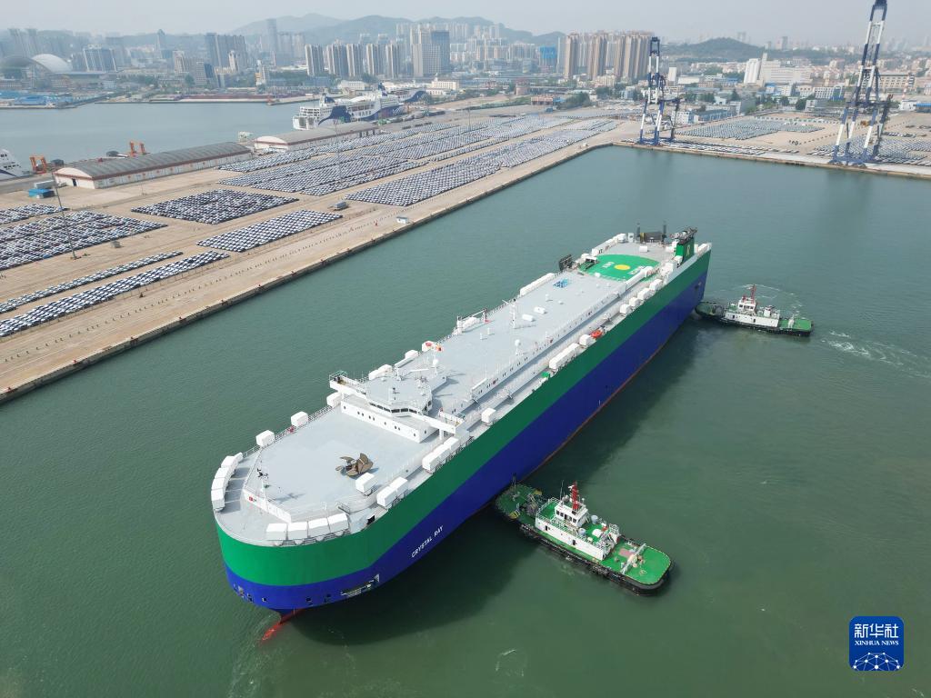 5月9日,一艘汽車(chē)滾裝船靠泊山東港口煙臺港裝載出口商品車(chē)(無(wú)人機照片)。