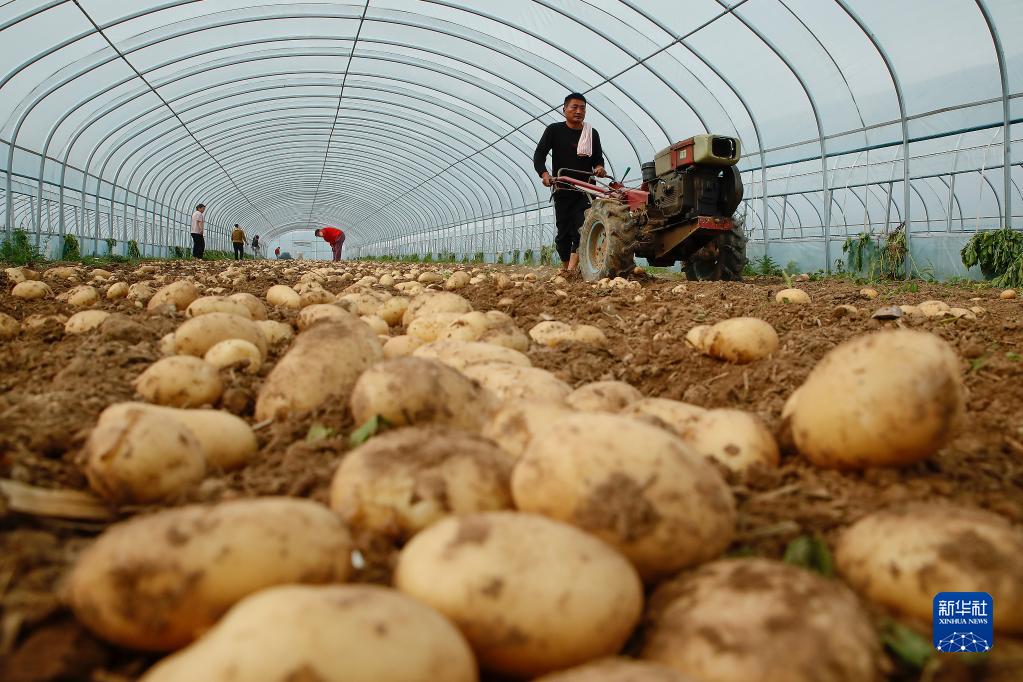 5月9日,在河南省開(kāi)封市尉氏縣邢莊鄉郭佛村,村民使用機械收獲土豆。