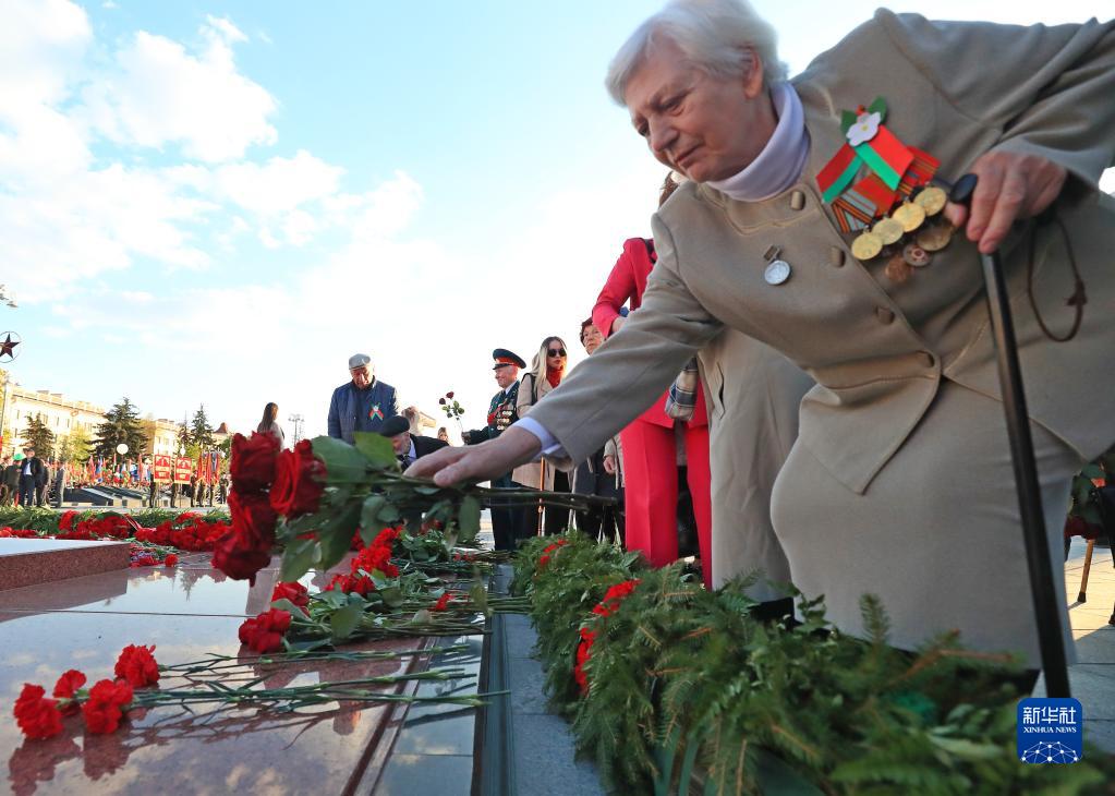 5月9日,白俄羅斯老兵代表在明斯克的勝利廣場(chǎng)向勝利紀念碑獻花。