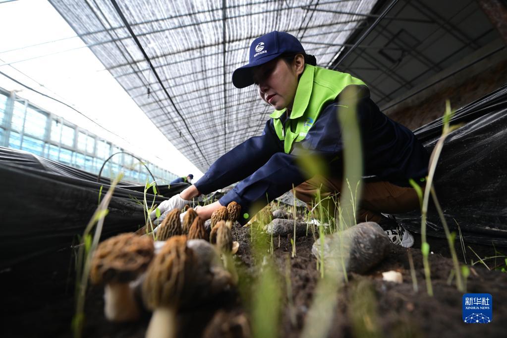 5月10日,在青海省西寧市大通回族土族自治縣景陽(yáng)鎮的設施溫棚內,青海卓辰農業(yè)科技發(fā)展有限公司工作人員在采摘羊肚菌。