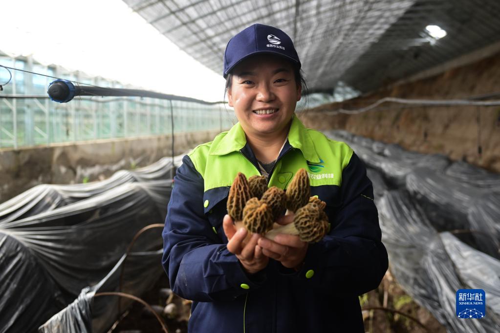 5月10日,在青海省西寧市大通回族土族自治縣景陽(yáng)鎮的設施溫棚內,青海卓辰農業(yè)科技發(fā)展有限公司工作人員展示成品羊肚菌。