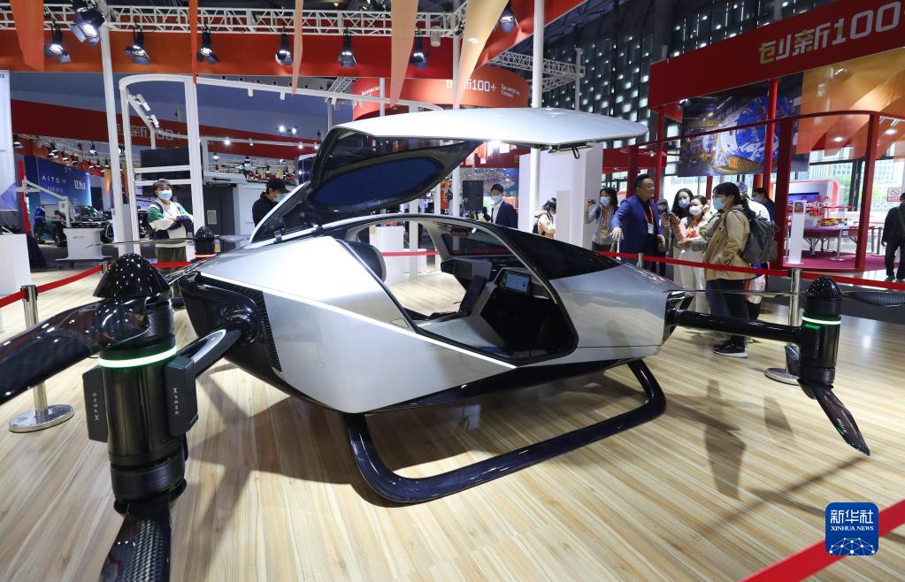 5月10日,參觀(guān)者在博覽會(huì )創(chuàng )新100+展區內的一輛飛行汽車(chē)前交流討論。