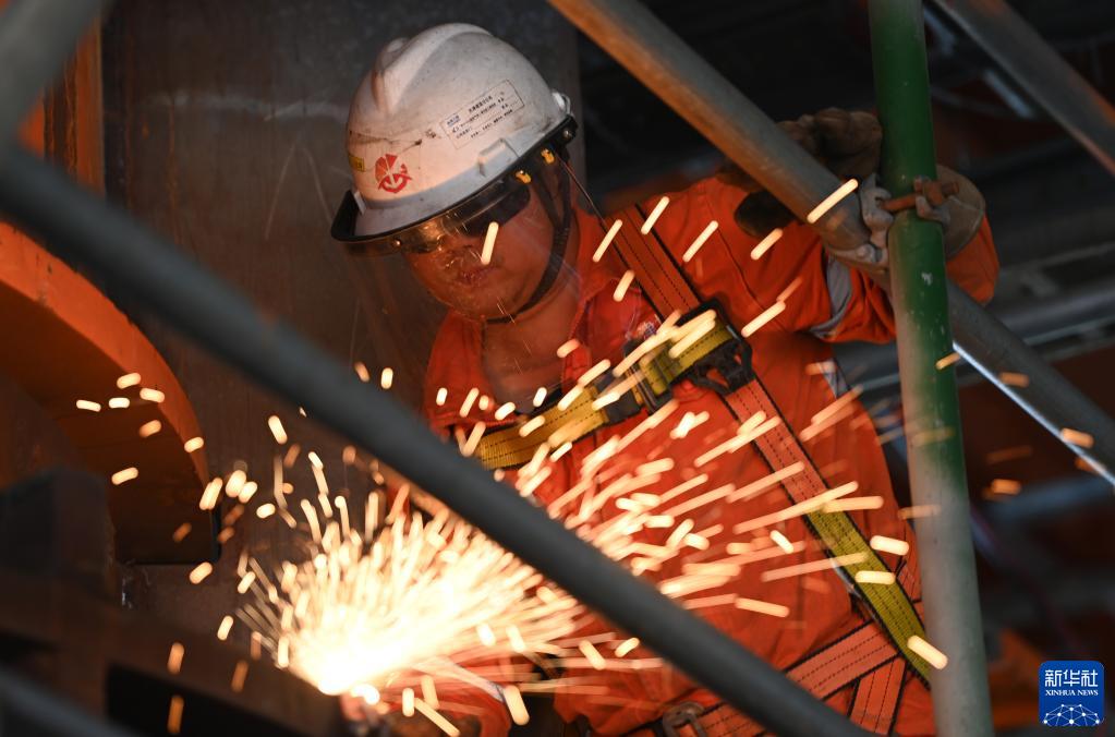 5月10日,工人在渤中19-6凝析氣田一期開(kāi)發(fā)項目平臺建造現場(chǎng)進(jìn)行施工作業(yè)。