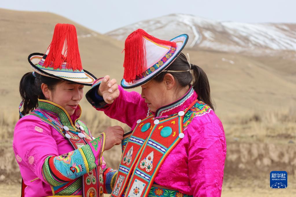 5月9日,在甘肅省張掖市肅南裕固族自治縣大河鄉西岔河村,巴爾斯雪山腳下的裕固族村民互相整理民族服飾。