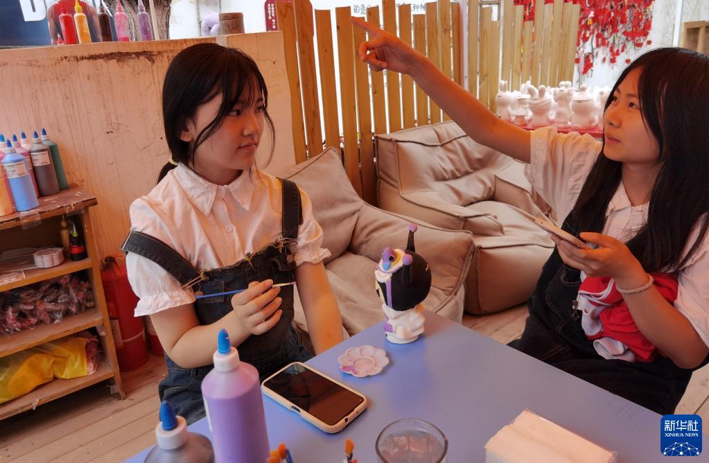 5月10日,兩名年輕人在山東濟寧環(huán)西北里文創(chuàng )街區體驗手工項目。