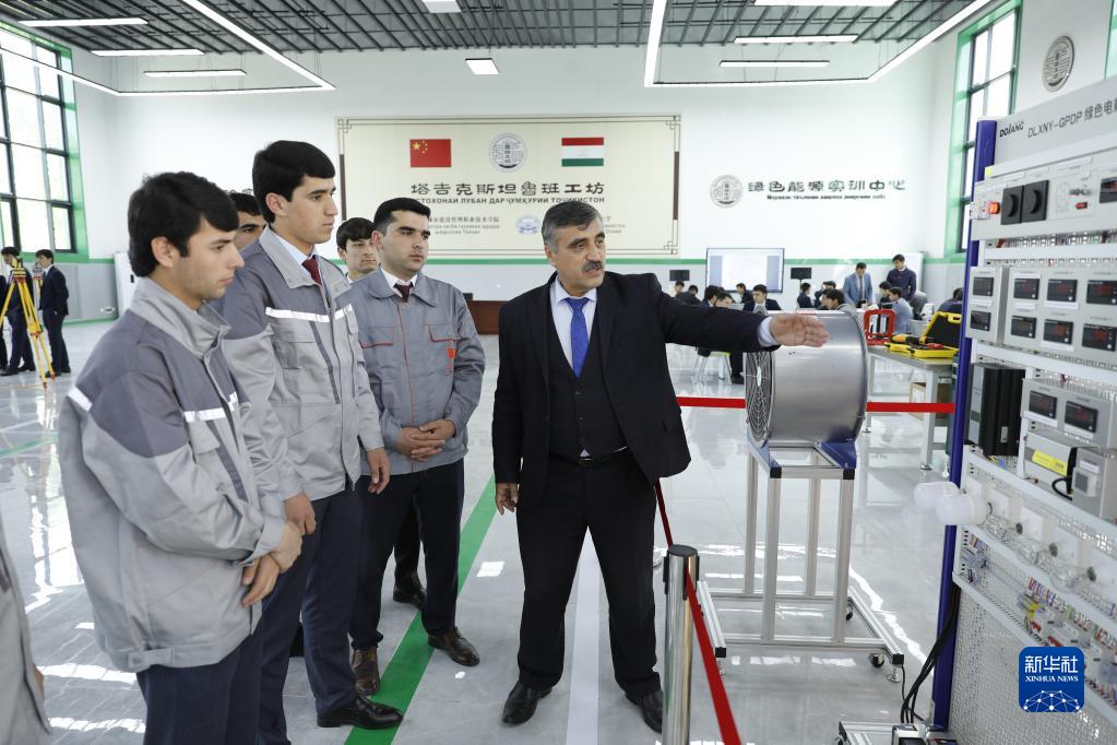 4月12日,在塔吉克斯坦首都杜尚別的魯班工坊內,塔方教授向學(xué)生講解綠色電能展示平臺的功能與使用方法。
