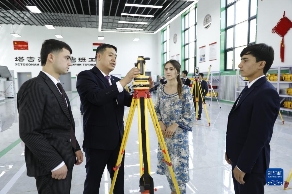4月12日,在塔吉克斯坦首都杜尚別的魯班工坊內,來(lái)自天津城市建設管理職業(yè)技術(shù)學(xué)院的老師吳正鵬(左二)向學(xué)生講解測繪儀器使用方法。