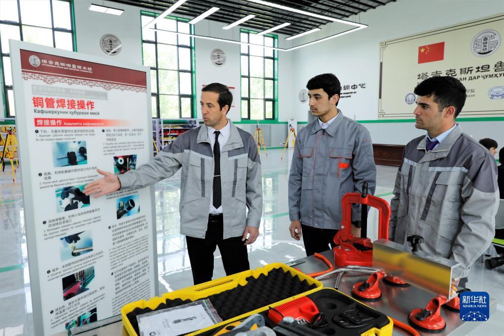 4月12日,在塔吉克斯坦首都杜尚別的魯班工坊內,塔方教授向學(xué)生講解鋼管焊接操作注意事項。