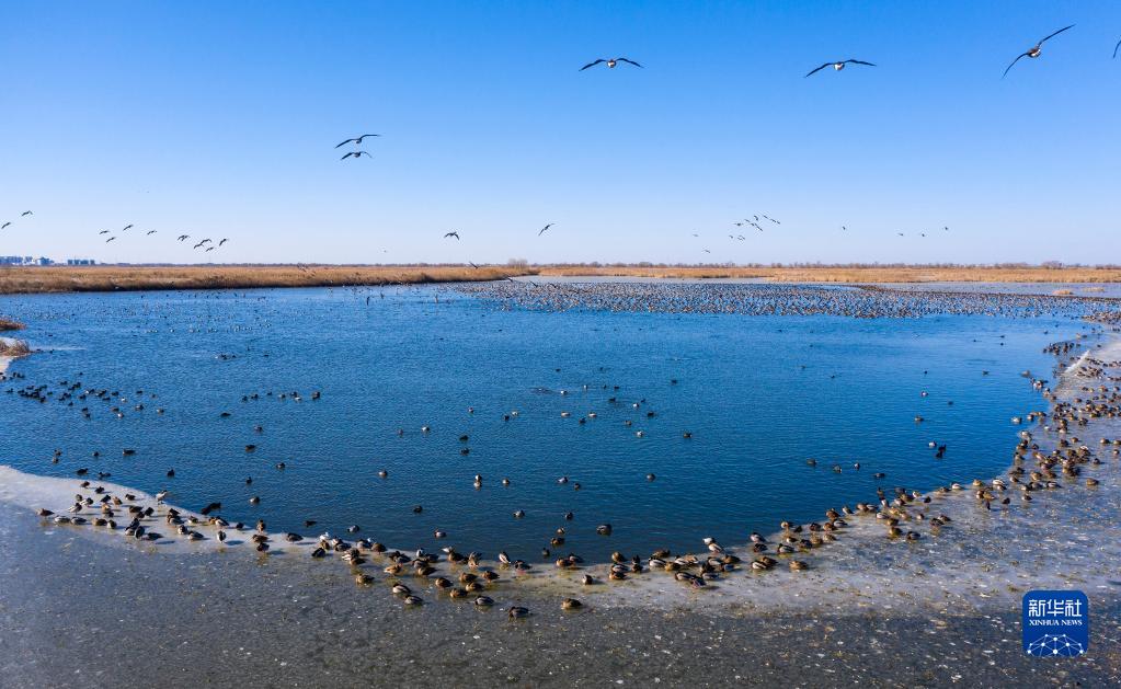 這是鳥(niǎo)類(lèi)在中國河北省衡水湖棲息的資料照片(2022年12月22日攝,無(wú)人機照片)。