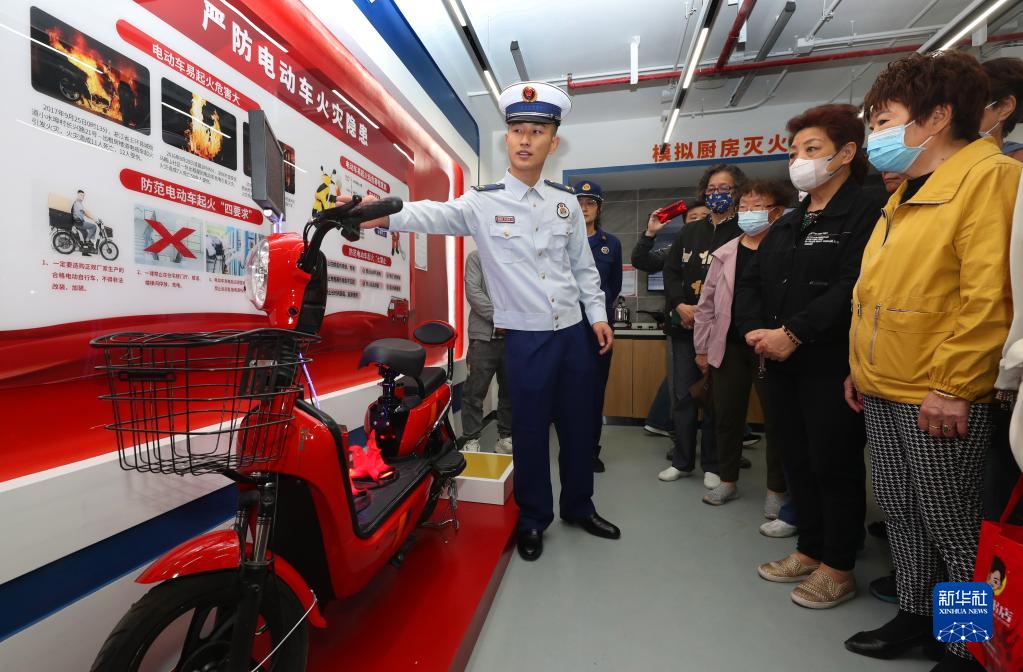 5月11日,長(cháng)寧區消防救援支隊的消防員向社區居民講解電動(dòng)車(chē)充電存在的火災風(fēng)險。