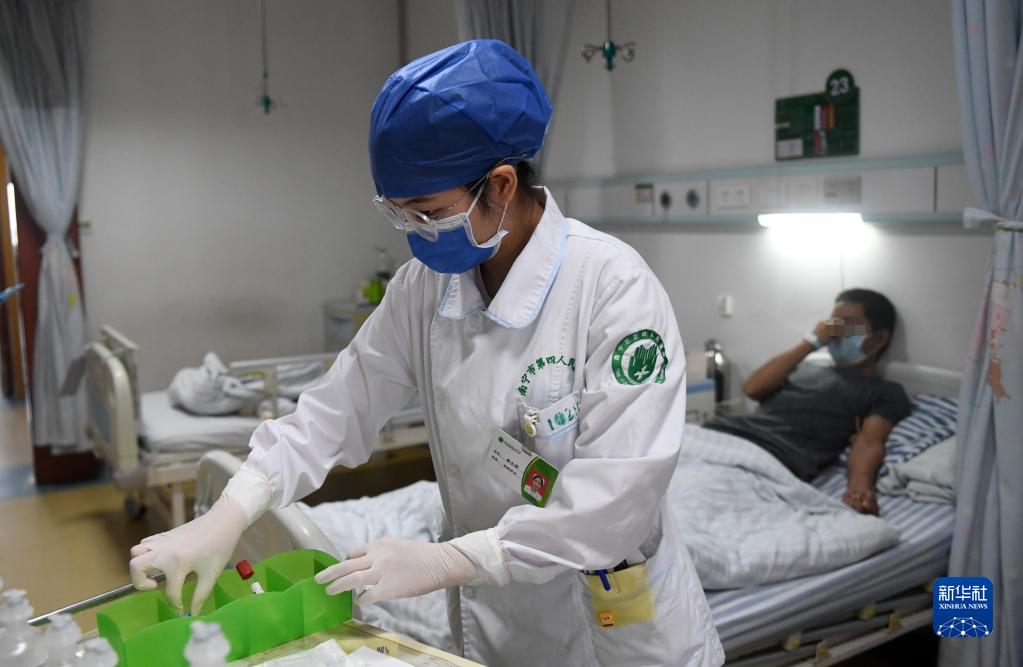 5月10日,在廣西南寧市第四人民醫院,黃小賢在病房里準備給病人抽血。