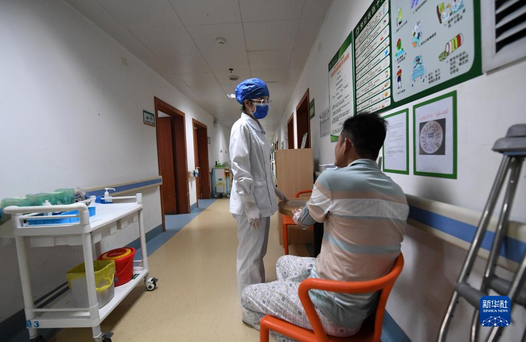 5月10日,在廣西南寧市第四人民醫院,黃小賢在病房區走廊和病人談心。