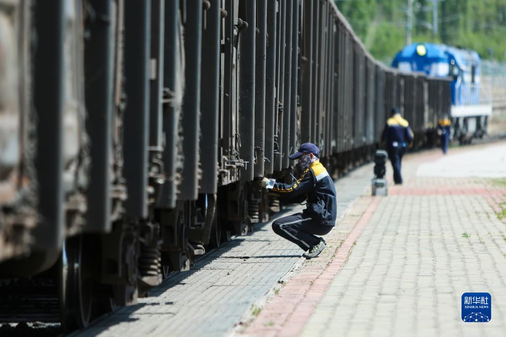 5月11日,在新疆霍爾果斯鐵路口岸,工作人員在駝峰場(chǎng)內進(jìn)行車(chē)廂解體作業(yè)。