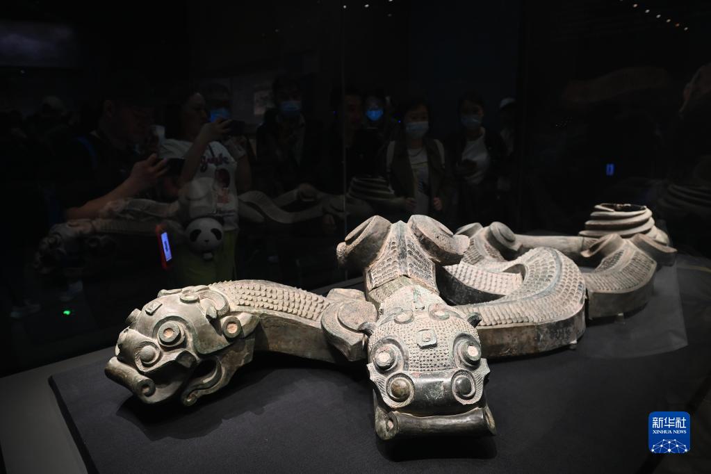 5月11日,游客在陜西歷史博物館參觀(guān)館藏戰國文物青銅龍。