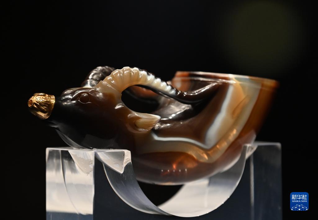 5月11日在陜西歷史博物館拍攝的館藏唐代文物鑲金獸首瑪瑙杯。