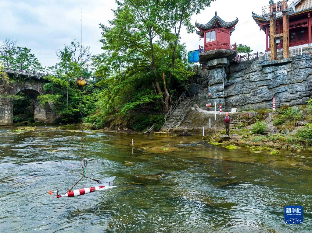 5月10日,在貴州省黃果樹(shù)水文監測站,水文工作人員在觀(guān)察纜道測流鉛魚(yú)入水情況。