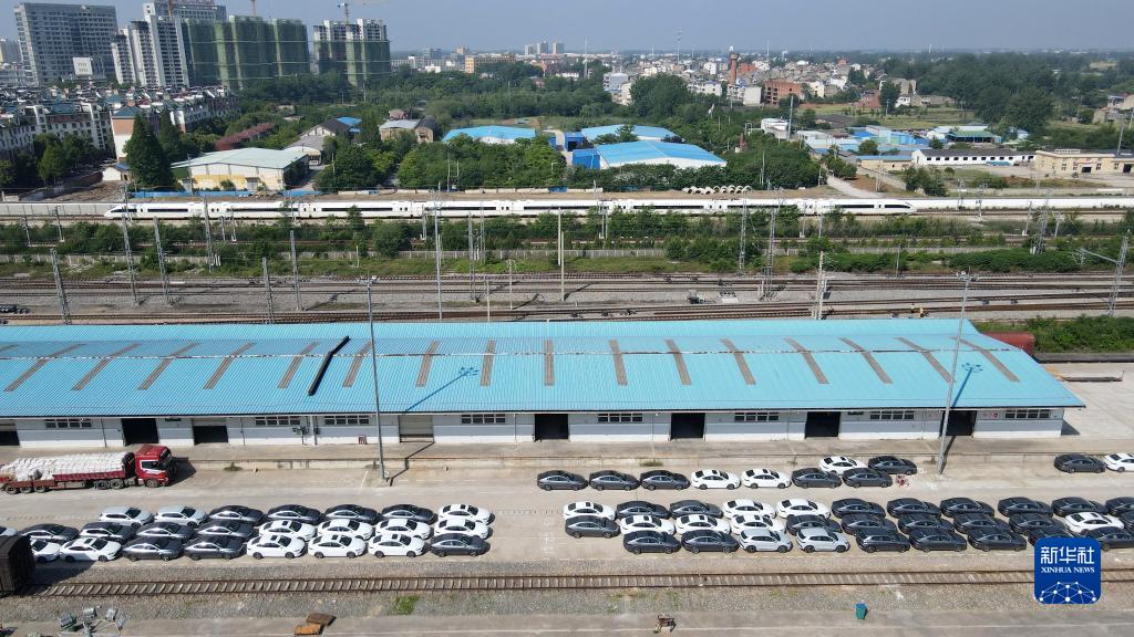 這是位于合肥市長(cháng)豐縣的鐵路水家湖貨運站等待裝車(chē)外運的新能源汽車(chē)(5月9日,無(wú)人機照片)。新華社記者 劉軍喜 攝