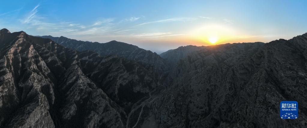 日落時(shí)分的內蒙古賀蘭山國家級自然保護區(5月11日攝,無(wú)人機全景照片)。