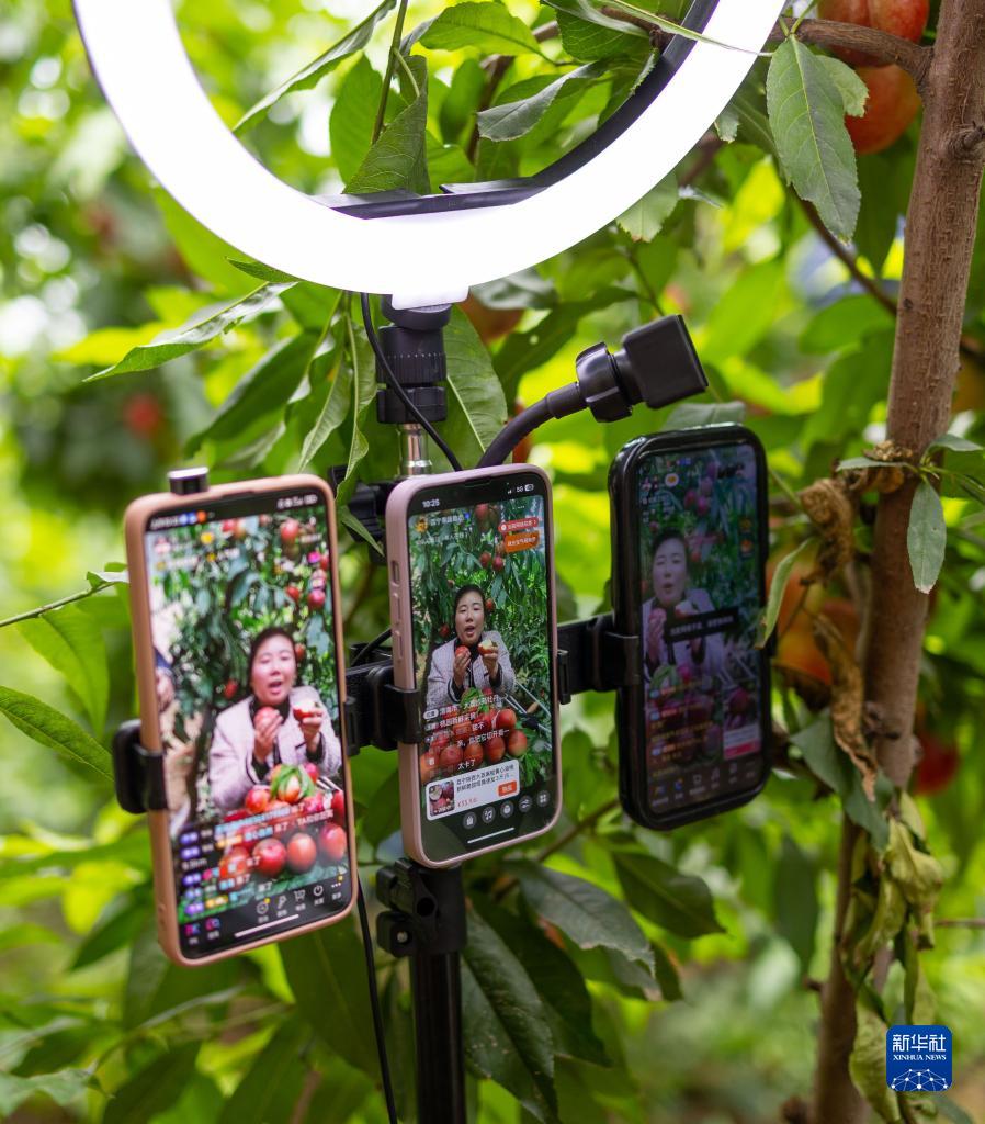 5月10日,在陜西渭南市大荔縣埝橋鎮北黃村油桃大棚,馬寧在三個(gè)平臺一起做直播帶貨售賣(mài)油桃。