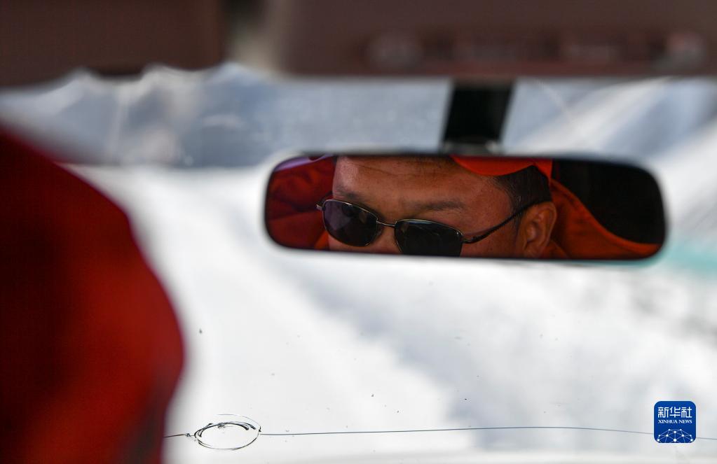 烏蘭薩德克養護站工人宋雪嶺駕車(chē)行駛在獨庫公路上(5月9日攝)。長(cháng)時(shí)間雪地作業(yè)須佩戴墨鏡,前擋風(fēng)玻璃上的裂痕為山體落石所致。