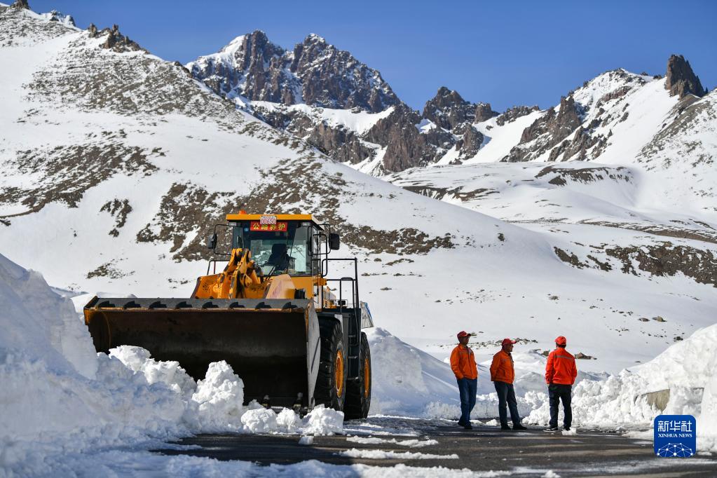 完成當日的清雪作業(yè)任務(wù)后,烏蘭薩德克養護站工人亞力坤·賽買(mǎi)提(左)、烏斯曼·巴克(中)和宋雪嶺在一旁休息聊天(5月10日攝)。