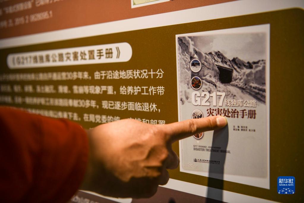 烏蘭薩德克養護站的工人在站里的文化展板旁介紹依托護路實(shí)踐經(jīng)驗而編寫(xiě)的《G217線(xiàn)獨庫公路災害處置手冊》(5月10日攝)。在長(cháng)期的護路工作中,工人們總結了大量實(shí)用方法,積極應對公路地質(zhì)災害。